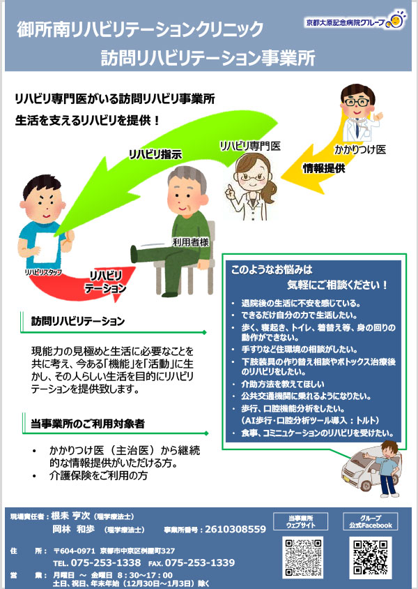 御所南リハビリテーションクリニックで行っているサービスや治療法をまとめたパンフレットです。PDFにて公開しておりますのでご覧ください。 リハビリテーションについて、親しみを持って理解を深めていただけるようマンガでご紹介しています。ご希望の方へは、無料でお配りしておりますので気軽にお問い合わせ下さい。